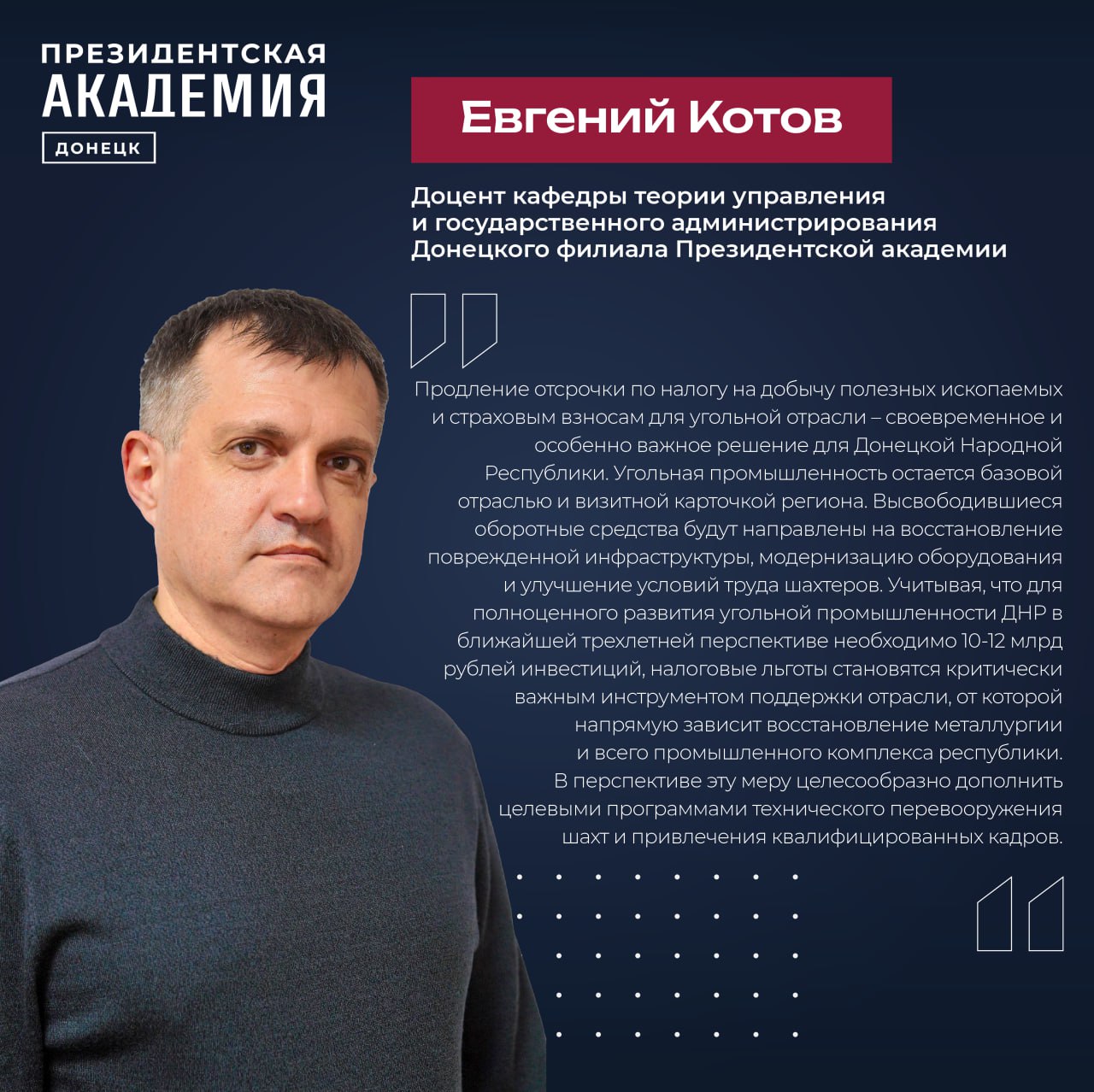 По мнению доцента кафедры теории управления и государственного администрирования Донецкого филиала Президентской академии Евгения Котова: «Продление отсрочки по налогу на добычу полезных ископаемых и страховым взносам для угольной отрасли – своевременное и особенно важное решение для Донецкой Народной Республики. Угольная промышленность остается базовой отраслью и визитной карточкой региона. Высвободившиеся оборотные средства будут направлены на восстановление поврежденной инфраструктуры, модернизацию оборудования и улучшение условий труда шахтеров. Учитывая, что для полноценного развития угольной промышленности ДНР в ближайшей трехлетней перспективе необходимо 10-12 млрд рублей инвестиций, налоговые льготы становятся критически важным инструментом поддержки отрасли, от которой напрямую зависит восстановление металлургии и всего промышленного комплекса республики. В перспективе эту меру целесообразно дополнить целевыми программами технического перевооружения шахт и привлечения квалифицированных кадров».