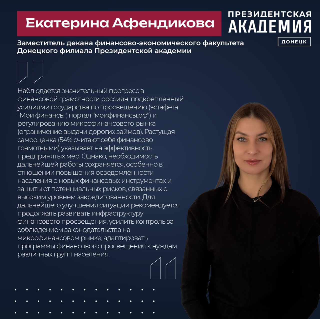 Одно из них — ограничение количества одновременно действующих дорогих займов. С октября этого года начнется переходный период по введению этой нормы. На первом этапе МФО не смогут выдать заемщику более двух займов с полной стоимостью потребительского кредита (ПСК) свыше 200% годовых. А уже с апреля 2027 года вступят в силу ограничения «один заем в руки» с ПСК свыше 100% годовых. Кроме того, между такими займами будет установлен трехдневный период охлаждения. Заместитель декана финансово-экономического факультета Донецкого филиала Президентской академии Екатерина Афендикова отмечает, что сейчас «наблюдается значительный прогресс в финансовой грамотности россиян, подкрепленный усилиями государства по просвещению (эстафета "Мои финансы", портал "моифинансы.рф") и регулированию микрофинансового рынка (ограничение выдачи дорогих займов). Растущая самооценка (54% считают себя финансово грамотными) указывает на эффективность предпринятых мер. Однако, необходимость дальнейшей работы сохраняется, особенно в отношении повышения осведомленности населения о новых финансовых инструментах и защиты от потенциальных рисков, связанных с высоким уровнем закредитованности. Для дальнейшего улучшения ситуации рекомендуется продолжать развивать инфраструктуру финансового просвещения, усилить контроль за соблюдением законодательства на микрофинансовом рынке, адаптировать программы финансового просвещения к нуждам различных групп населения».