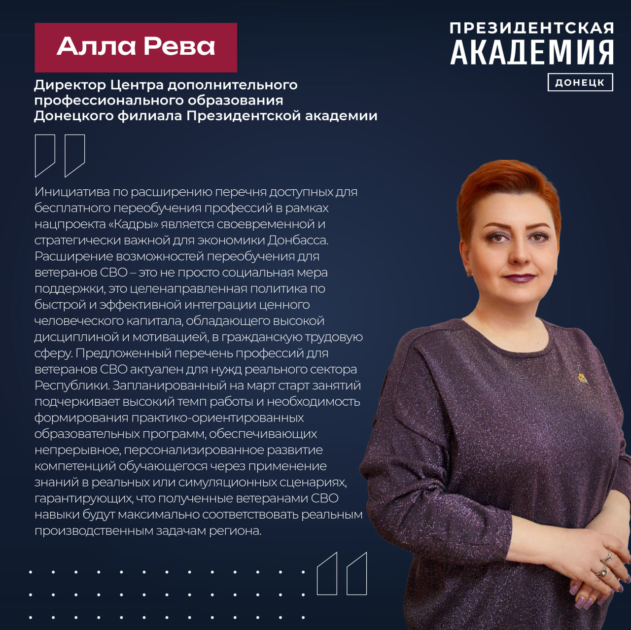 Директор Центра дополнительного профессионального образования Донецкого филиала Президентской академии Алла Рева отмечает: «Инициатива по расширению перечня доступных для бесплатного переобучения профессий в рамках нацпроекта «Кадры» является своевременной и стратегически важной для экономики Донбасса. Расширение возможностей переобучения для ветеранов СВО – это не просто социальная мера поддержки, это целенаправленная политика по быстрой и эффективной интеграции ценного человеческого капитала, обладающего высокой дисциплиной и мотивацией, в гражданскую трудовую сферу. Предложенный перечень профессий для ветеранов СВО актуален для нужд реального сектора Республики. Запланированный на март старт занятий подчеркивает высокий темп работы и необходимость формирования практико-ориентированных образовательных программ, обеспечивающих непрерывное, персонализированное развитие компетенций обучающегося через применение знаний в реальных или симуляционных сценариях, гарантирующих, что полученные ветеранами СВО навыки будут максимально соответствовать реальным производственным задачам региона».