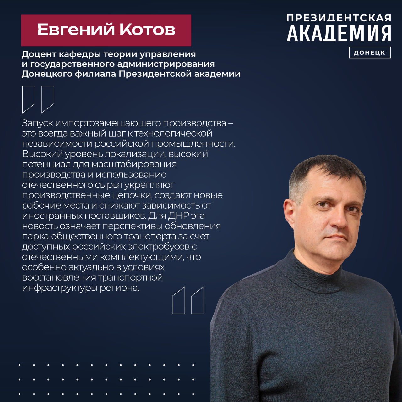 Доцент кафедры теории управления и государственного администрирования Донецкого филиала Президентской академии Евгений Котов считает, что «Запуск импортозамещающего производства – это всегда важный шаг к технологической независимости российской промышленности. Высокий уровень локализации, высокий потенциал для масштабирования производства и использование отечественного сырья укрепляют производственные цепочки, создают новые рабочие места и снижают зависимость от иностранных поставщиков. Для ДНР эта новость означает перспективы обновления парка общественного транспорта за счет доступных российских электробусов с отечественными комплектующими, что особенно актуально в условиях восстановления транспортной инфраструктуры региона».