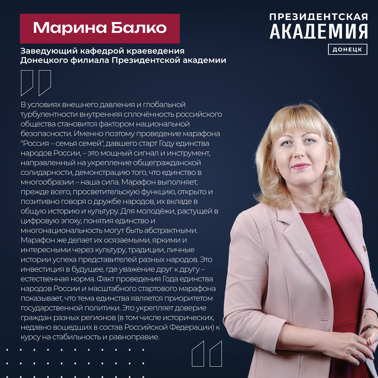 Заведующий кафедрой краеведения Донецкого филиала Президентской академии Марина Балко считает, что «в условиях внешнего давления и глобальной турбулентности внутренняя сплочённость российского общества становится фактором национальной безопасности. Именно поэтому проведение марафона "Россия – семья семей", давшего старт Году единства народов России, – это мощный сигнал и инструмент, направленный на укрепление общегражданской солидарности, демонстрацию того, что единство в многообразии – наша сила. Марафон выполняет, прежде всего, просветительскую функцию, открыто и позитивно говоря о дружбе народов, их вкладе в общую историю и культуру. Для молодёжи, растущей в цифровую эпоху, понятия единство и многонациональность могут быть абстрактными. Марафон же делает их осязаемыми, яркими и интересными через культуру, традиции, личные истории успеха представителей разных народов. Это инвестиция в будущее, где уважение друг к другу – естественная норма. Факт проведения Года единства народов России и масштабного стартового марафона показывает, что тема единства является приоритетом государственной политики. Это укрепляет доверие граждан разных регионов (в том числе исторических, недавно вошедших в состав Российской Федерации) к курсу на стабильность и равноправие».