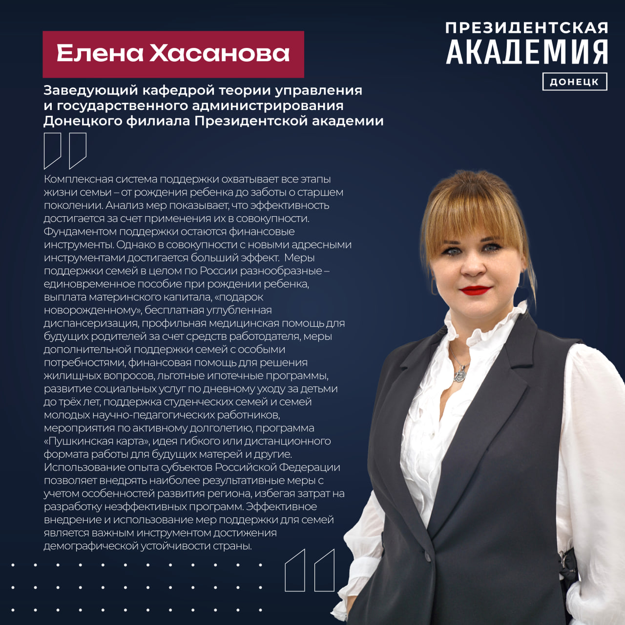 По мнению заведующего кафедрой теории управления и государственного администрирования Донецкого филиала Президентской академии Елены Хасановой «комплексная система поддержки охватывает все этапы жизни семьи – от рождения ребенка до заботы о старшем поколении. Анализ мер показывает, что эффективность достигается за счет применения их в совокупности. Фундаментом поддержки остаются финансовые инструменты. Однако в совокупности с новыми адресными инструментами достигается больший эффект. Меры поддержки семей в целом по России разнообразные – единовременное пособие при рождении ребенка, выплата материнского капитала, «подарок новорожденному», бесплатная углубленная диспансеризация, профильная медицинская помощь для будущих родителей за счет средств работодателя, меры дополнительной поддержки семей с особыми потребностями, финансовая помощь для решения жилищных вопросов, льготные ипотечные программы, развитие социальных услуг по дневному уходу за детьми до трёх лет, поддержка студенческих семей и семей молодых научно-педагогических работников, мероприятия по активному долголетию, программа «Пушкинская карта», идея гибкого или дистанционного формата работы для будущих матерей и другие. Использование опыта субъектов Российской Федерации позволяет внедрять наиболее результативные меры с учетом особенностей развития региона, избегая затрат на разработку неэффективных программ. Эффективное внедрение и использование мер поддержки для семей является важным инструментом достижения демографической устойчивости страны».