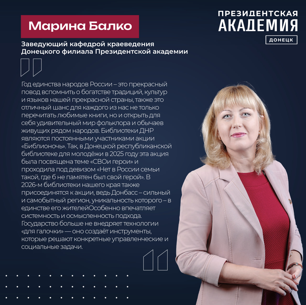 Заведующий кафедрой краеведения Донецкого филиала Президентской академии Марина Балко отмечает, что «"Библионочь" – уникальное научно-просветительское и культурное событие, давно ставшее одним из самых любимых и ожидаемых в нашей стране. Символично, что в 2026 году акция будет приурочена к Году единства народов России, благодаря чему получит глубокое и по истине объединяющее звучание. Год единства народов России – это прекрасный повод вспомнить о богатстве традиций, культур и языков нашей прекрасной страны, также это отличный шанс для каждого из нас не только перечитать любимые книги, но и открыть для себя удивительный мир фольклора и обычаев живущих рядом народов. Библиотеки ДНР являются постоянными участниками акции «Библионочь». Так, в Донецкой республиканской библиотеке для молодёжи в 2025 году эта акция была посвящена теме «СВОи герои» и проходила под девизом «Нет в России семьи такой, где б не памятен был свой герой». В 2026-м библиотеки нашего края также присоединятся к акции, ведь Донбасс – сильный и самобытный регион, уникальность которого – в единстве его жителей».