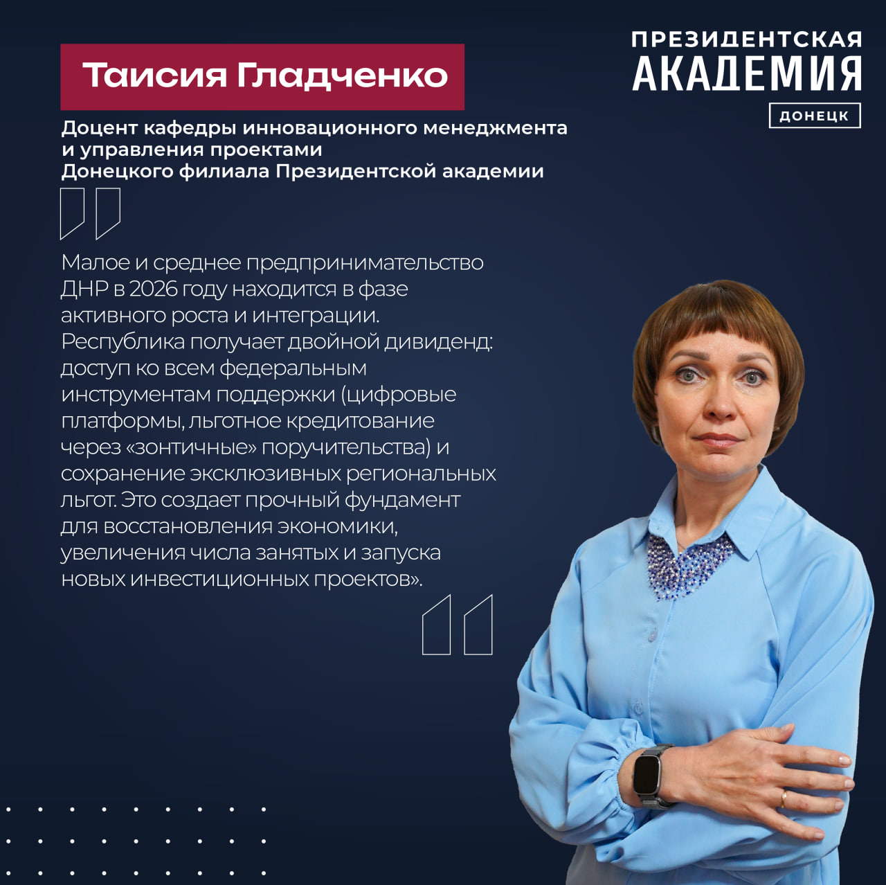 Доцент кафедры инновационного менеджмента и управления проектами Донецкого филиала Президентской академии Таисия Гладченко отмечает, что «текущая ситуация в сегменте МСП в ДНР характеризуется формированием уникальной двухконтурной системы поддержки. С одной стороны, бизнес ДНР уже полноценно интегрирован в общероссийские механизмы стимулирования предпринимательства, с другой — для региона сохраняются существенные преференции, учитывающие его особый статус и экономические реалии. В декабре 2025 года Народный Совет Республики продлил действие пониженных ставок по упрощенной системе налогообложения (УСН) до 31 декабря 2027 года. Это означает, что местный бизнес продолжит платить налог по ставке всего 1% (при объекте «доходы») и 5% (при объекте «доходы минус расходы»). Эта беспрецедентная льгота дает предпринимателям ДНР долгосрочный горизонт планирования и значительно снижает фискальную нагрузку по сравнению с коллегами из других регионов РФ. Если в целом по России основной объем господдержки в 2025 году пришелся на льготные микрозаймы, то для ДНР ключевым событием 2026 года стало расширение «зонтичного» механизма поручительств. Корпорация МСП увеличила лимит до 5 млрд рублей, что позволит предпринимателям Республики привлечь в банках не менее 10 млрд рублей кредитных средств. Это прямое продолжение политики интеграции: по итогам 2025 года объем кредитования МСП в исторических регионах с использованием этого инструмента уже вырос и продолжил увеличиваться в 2026-м. Важно, что поручительство покрывает до 50% от суммы кредита, решая главную проблему бизнеса — недостаток залоговой базы. Малое и среднее предпринимательство ДНР в 2026 году находится в фазе активного роста и интеграции. Республика получает двойной дивиденд: доступ ко всем федеральным инструментам поддержки (цифровые платформы, льготное кредитование через «зонтичные» поручительства) и сохранение эксклюзивных региональных льгот. Это создает прочный фундамент для восстановления экономики, увеличения числа занятых и запуска новых инвестиционных проектов».