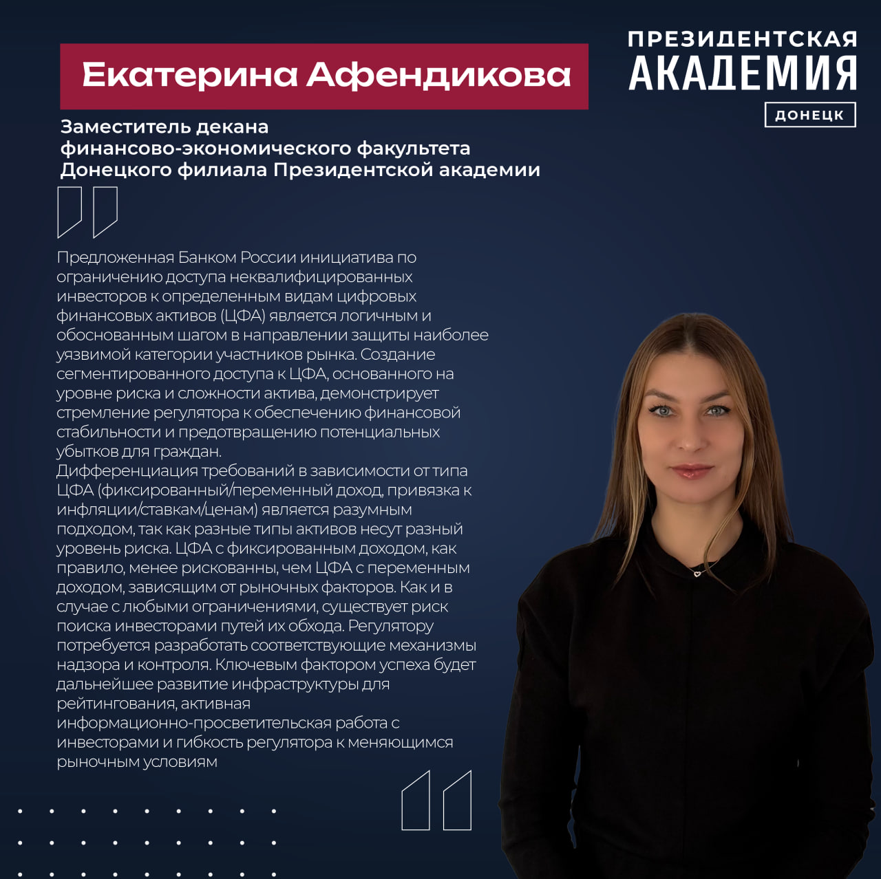 Заместитель декана финансово-экономического факультета Донецкого филиала Президентской академии Екатерина Афендикова отмечает, что «Предложенная Банком России инициатива по ограничению доступа неквалифицированных инвесторов к определенным видам цифровых финансовых активов (ЦФА) является логичным и обоснованным шагом в направлении защиты наиболее уязвимой категории участников рынка. Создание сегментированного доступа к ЦФА, основанного на уровне риска и сложности актива, демонстрирует стремление регулятора к обеспечению финансовой стабильности и предотвращению потенциальных убытков для граждан.