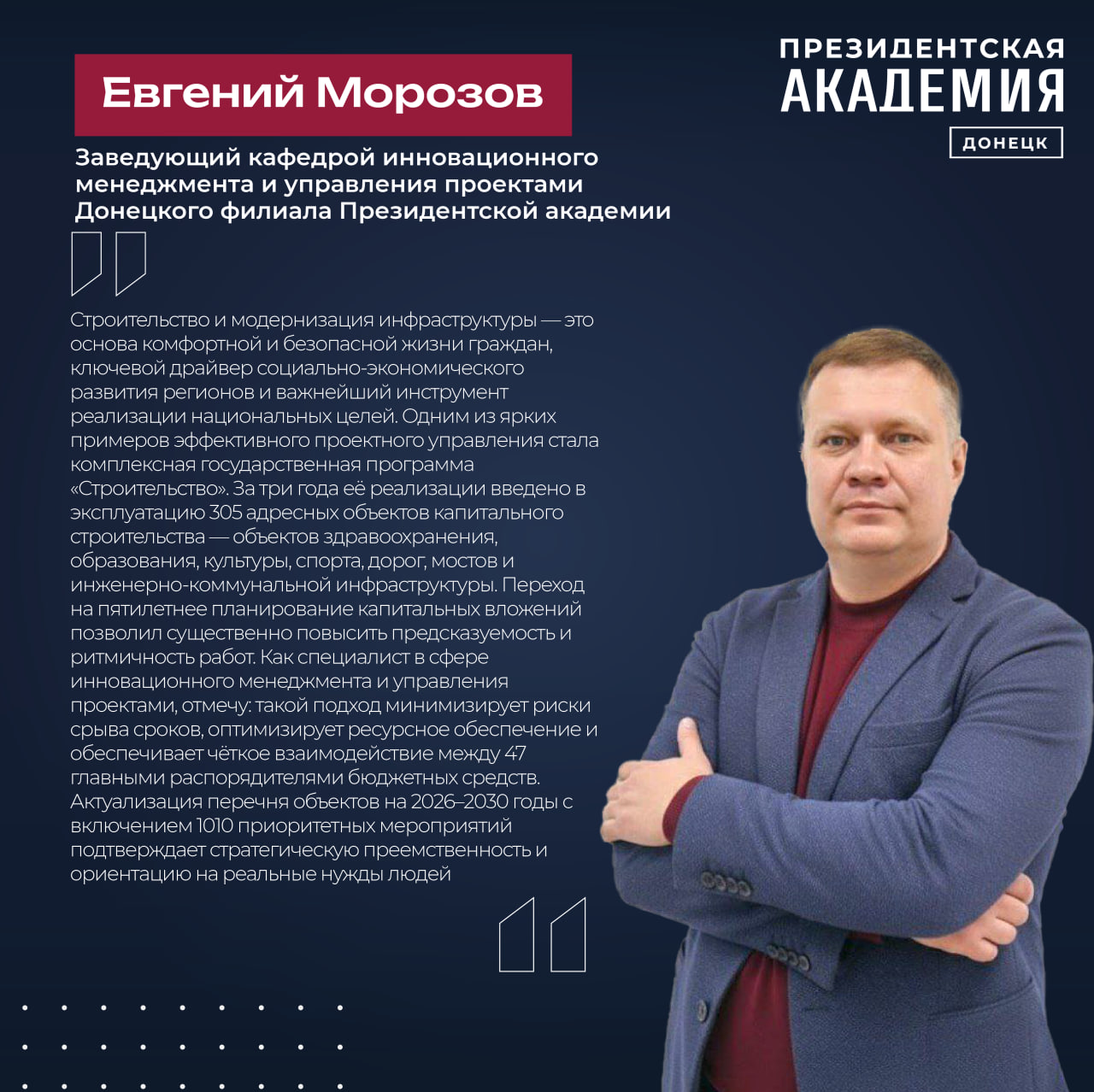 Заведующий кафедрой инновационного менеджмента и управления проектами Донецкого филиала Президентской академии Евгений Морозов отмечает, что «Строительство и модернизация инфраструктуры — это основа комфортной и безопасной жизни граждан, ключевой драйвер социально-экономического развития регионов и важнейший инструмент реализации национальных целей. Одним из ярких примеров эффективного проектного управления стала комплексная государственная программа «Строительство». За три года её реализации введено в эксплуатацию 305 адресных объектов капитального строительства — объектов здравоохранения, образования, культуры, спорта, дорог, мостов и инженерно-коммунальной инфраструктуры. Переход на пятилетнее планирование капитальных вложений позволил существенно повысить предсказуемость и ритмичность работ. Как специалист в сфере инновационного менеджмента и управления проектами, отмечу: такой подход минимизирует риски срыва сроков, оптимизирует ресурсное обеспечение и обеспечивает чёткое взаимодействие между 47 главными распорядителями бюджетных средств. Актуализация перечня объектов на 2026–2030 годы с включением 1010 приоритетных мероприятий подтверждает стратегическую преемственность и ориентацию на реальные нужды людей».